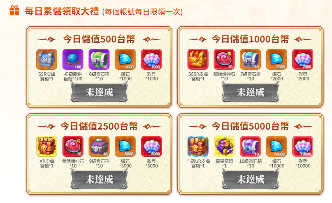 2、“每日累儲”達到活動條件每日僅可领取活動獎勵一次,儲值達到更高檔次,可以領取低檔次的獎勵,如:單日儲值5000台幣,可領取500、1000、2500、5000台幣檔次的禮包,以此類推。